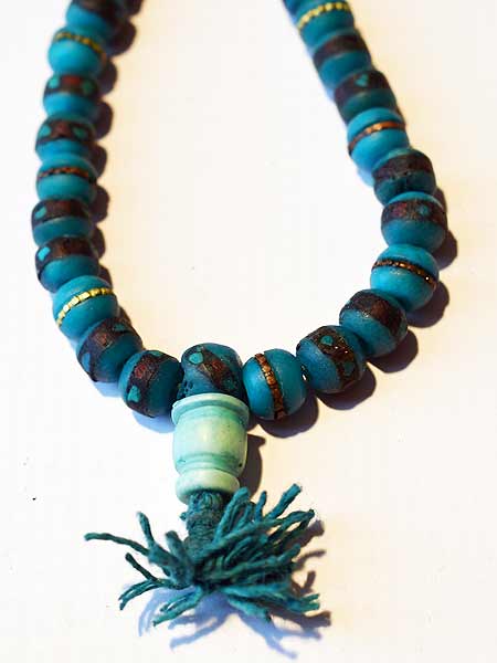Stunning dyed colouful bone mala, which has been carefully inlaid to give a typical Tibetan look to it